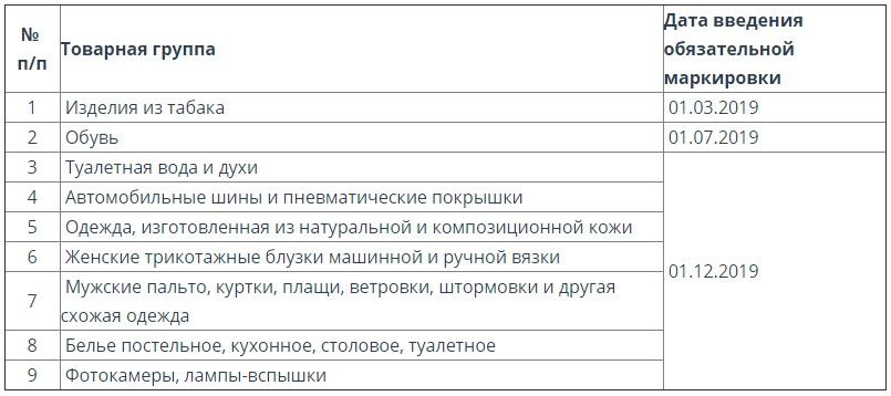 Согласно Постановлению от 28.04.2018 г. выделено 9 групп товарных позиций, которых коснется маркирование в 2019 году.